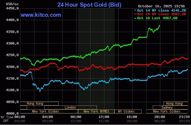 Giá vàng thế giới tiếp tục nối dài chuỗi ngày thăng hoa, liên tục thiết lập các đỉnh cao lịch sử mới. Chốt phiên giao dịch ngày 16/10, giá vàng giao ngay đã tăng “sốc” 118 USD, đạt mức 4.325 USD mỗi ounce. Đến sáng 17/10, đà tăng vẫn chưa dừng lại khi kim loại quý này chạm mốc 4.367 USD. Đây là phiên thứ tư liên tiếp giá vàng bứt phá lên mức kỷ lục, một tín hiệu rõ ràng cho thấy sức hấp dẫn không ngừng của kênh trú ẩn an toàn này.