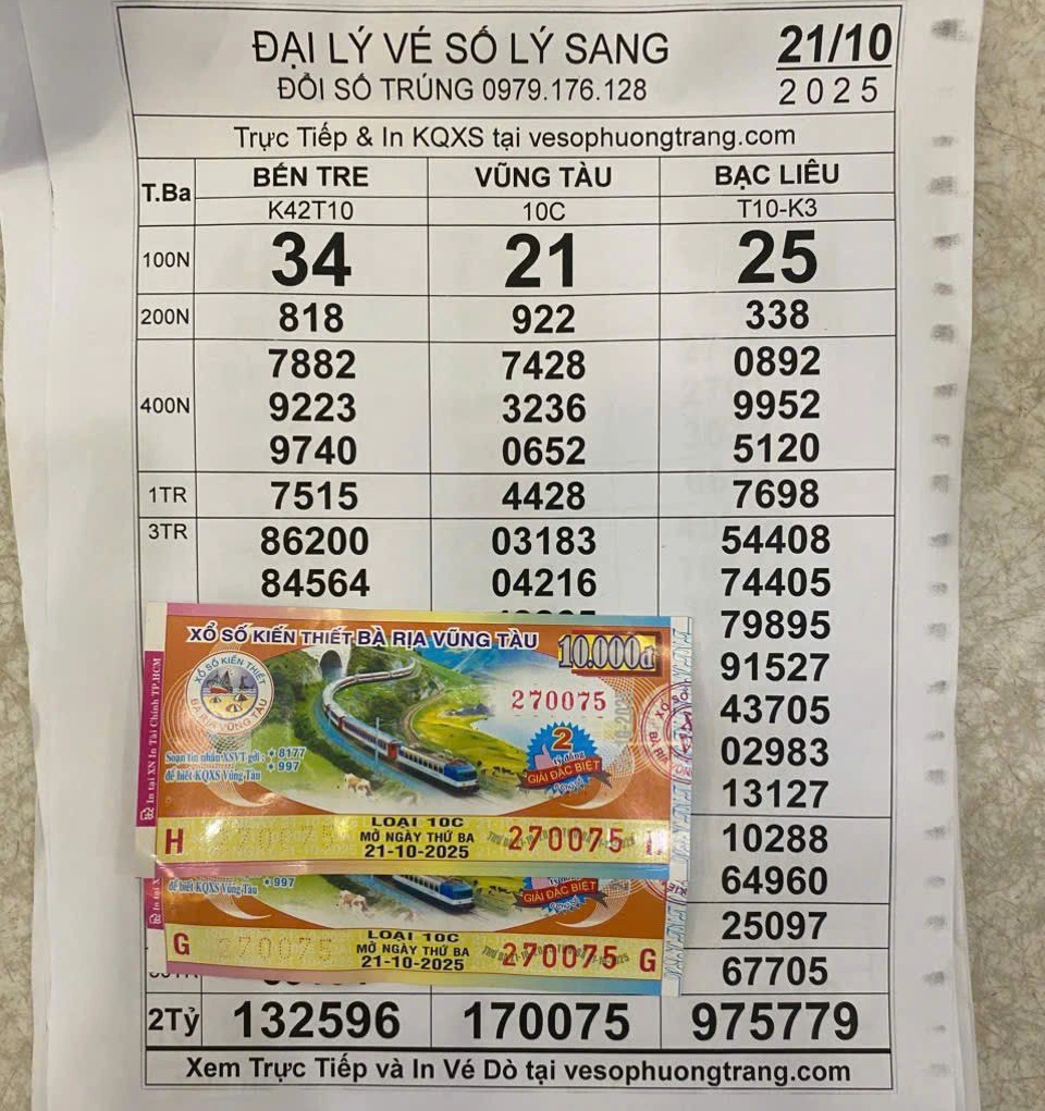 Niềm vui vỡ òa sau khi công bố kết quả xổ số miền Nam ngày 21 tháng 10! Tại TP.HCM, đại lý vé số Lý Sang đã nhanh chóng đổi thưởng thành công 2 tờ vé số trúng giải an ủi cho một vị khách may mắn. Cụ thể, 2 tờ vé số có dãy số 270075 thuộc đài Vũng Tàu đã mang về tổng cộng 100 triệu đồng (chưa trừ thuế) cho chủ nhân. Đáng chú ý, giải độc đắc của đài Vũng Tàu trong kỳ quay này thuộc về những tờ có dãy số 170075.
