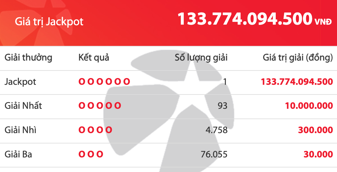 Đây là kết quả của 24 kỳ quay số liên tiếp tích lũy, đưa giá trị giải độc đắc Mega 6/45 lên tới con số choáng váng: 133.774.094.500 đồng. Không chỉ có một người may mắn độc đắc, kỳ quay số này còn mang đến tin vui cho hàng ngàn người chơi khác: 93 vé trúng giải Nhất, mỗi giải trị giá 10.000.000 đồng; 4.758 vé trúng giải Nhì, mỗi giải 300.000 đồng, cùng vô số giải thưởng nhỏ hơn.