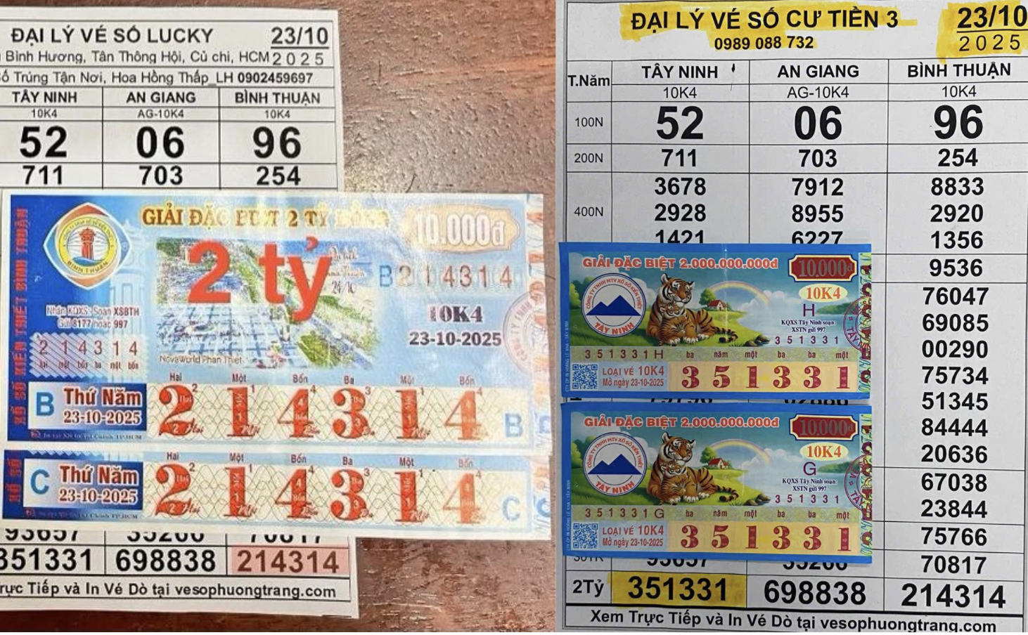 Cũng trong ngày 23 tháng 10 lịch sử này, cộng đồng mạng xã hội không ngừng chia sẻ hình ảnh đại lý vé số Lucky ở TP.HCM đổi thưởng cho khách hàng sở hữu 2 tờ vé số trúng độc đắc của Xổ số Bình Thuận. Những tờ vé số có dãy số 214314 này không chỉ bao gồm 2 giải độc đắc mà còn có thêm 3 tờ trúng giải an ủi, mỗi giải trị giá 50 triệu đồng. Thông tin này nhanh chóng thu hút hàng nghìn lượt tương tác, chúc mừng chủ nhân may mắn và không ít người nhiệt tình “xin vía” để được thần tài gõ cửa.