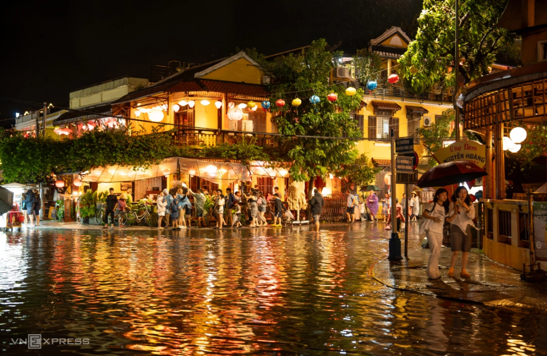 Dù vậy, sức hút của Hội An dâng lũ vẫn khó cưỡng. Nhiều tuyến phố vẫn khá đông đúc du khách qua lại. Đặc biệt, chợ đêm Nguyễn Hoàng trở thành tâm điểm náo nhiệt, nơi du khách chủ yếu trải nghiệm lội nước lụt, chiêm ngưỡng phố cổ về đêm với vẻ đẹp lung linh huyền ảo. Đến 21h, nước lũ sông Hoài tiếp tục dâng cao, báo hiệu một đêm dài đầy thử thách.