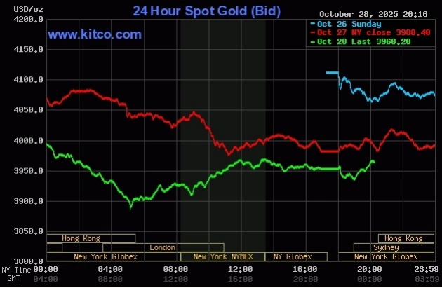 Thị trường vàng thế giới vừa trải qua một phiên giao dịch đầy biến động, khi giá vàng giao ngay ghi nhận mức giảm đáng kể vào cuối ngày 28/10. Cụ thể, giá vàng đã “bốc hơi” 29,5 USD, chốt phiên ở mức 3.951 USD một ounce. Đáng chú ý, trong suốt phiên, có thời điểm giá vàng chạm ngưỡng sát 3.900 USD, đánh dấu mức thấp nhất trong 3 tuần trở lại đây. Tuy nhiên, sang đến sáng 29/10, kim loại quý đã có dấu hiệu phục hồi nhẹ, nhích lên mức 3.960 USD.