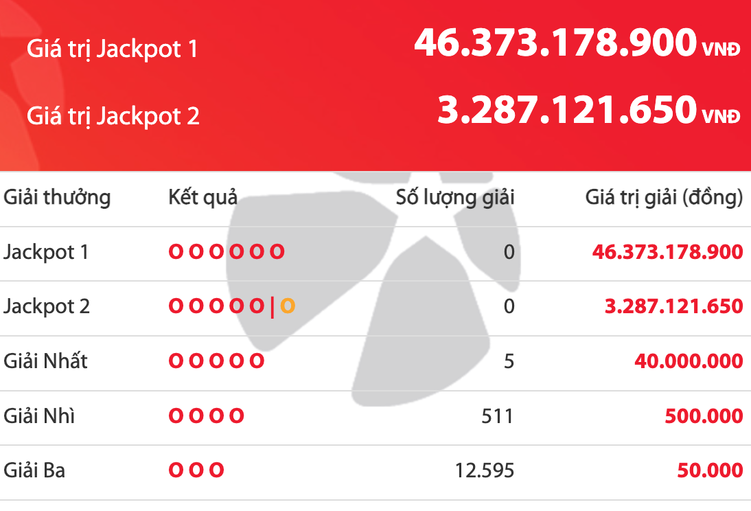 * **Giải Jackpot 1:** Đáng tiếc, kỳ quay này vẫn chưa tìm thấy chủ nhân của giải Jackpot 1. Với việc không có người trúng thưởng, giá trị Jackpot 1 tiếp tục được cộng dồn lên mức kỷ lục: **46.373.178.900 đồng**. Cơ hội trở thành tỷ phú đang đến gần hơn bao giờ hết!