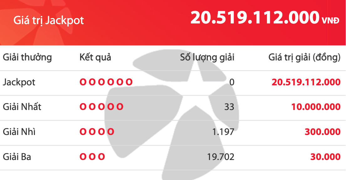 Việc giải độc đắc “vô chủ” đã đẩy số tiền cộng dồn của xổ số Mega 6/45 lên một con số ấn tượng: **20.519.112.000 đồng** (hơn 20,5 tỷ đồng) cho kỳ quay tiếp theo. Mặc dù Jackpot chưa có người trúng, Vietlott vẫn ghi nhận nhiều giải thưởng giá trị khác đã tìm được chủ nhân. Cụ thể, có **33 người chơi** may mắn trúng giải Nhất, mỗi giải trị giá **10.000.000 đồng**. Hơn thế nữa, **1.197 người** đã giành giải Nhì trị giá **300.000 đồng**, cùng với hàng nghìn giải Ba khác.