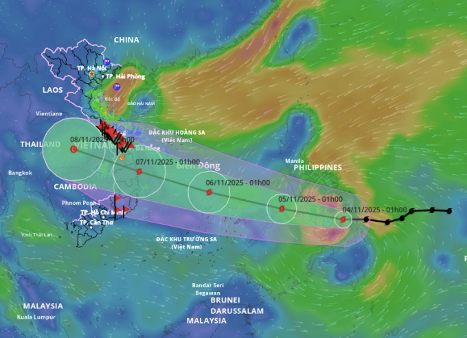 * **Trên biển:** Vùng biển phía đông của khu vực giữa Biển Đông sẽ có gió mạnh dần lên cấp 6-7, sau đó tăng nhanh lên cấp 8-13, giật cấp 15-16, sóng biển có thể cao 5-7 m. Đặc biệt nguy hiểm, trong hai ngày 5-6/11, khu vực giữa Biển Đông (bao gồm quần đảo Trường Sa) và vùng biển ngoài khơi từ Đà Nẵng đến Khánh Hòa có khả năng hứng chịu gió mạnh cấp 12-14, giật trên cấp 17, kèm sóng biển cao khủng khiếp từ 8-10 m.