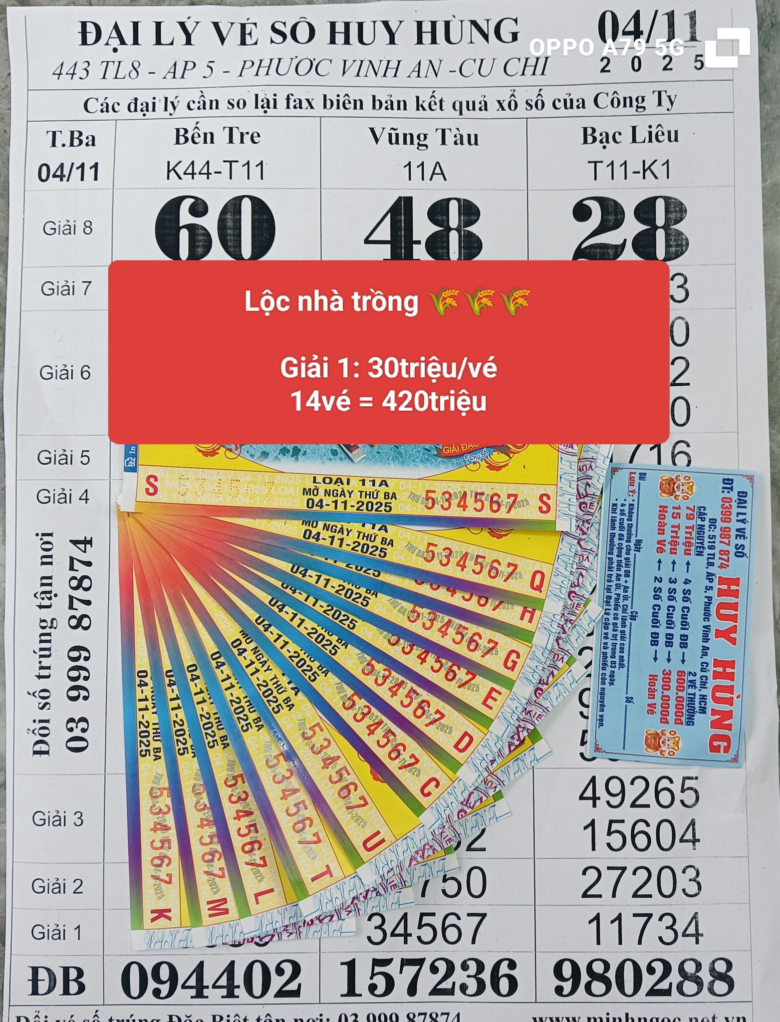 Không chỉ riêng Củ Chi, cùng ngày 4 tháng 11 định mệnh đó, một tin vui lớn khác cũng đến từ Cần Thơ. Đại lý vé số 79 tại đây vừa xác nhận đã đổi thưởng thành công 14 tờ vé số trúng giải an ủi với tổng giá trị lên đến 700 triệu đồng (chưa trừ thuế) cho một vị khách hàng may mắn khác. Những tờ vé số này sở hữu dãy số 380288, thuộc đài Bạc Liêu. Đây là giải an ủi của giải độc đắc, bởi giải độc đắc chính thức của đài Bạc Liêu ngày hôm đó thuộc về những người sở hữu tờ vé có dãy số 980288. Sự trùng hợp về số lượng vé trúng lớn trong cùng một ngày càng khiến câu chuyện về xổ số miền Nam trở nên kịch tính và hấp dẫn hơn bao giờ hết.