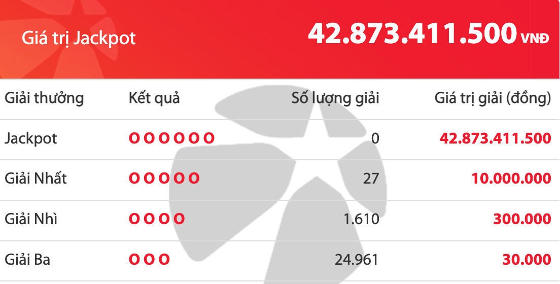 Với việc giải độc đắc “vô chủ”, quỹ Jackpot của Mega 6/45 tiếp tục tích lũy, nâng tổng giá trị lên mức “khủng” 42.873.411.500 đồng. Bên cạnh giải Jackpot đang chờ đợi, kỳ quay tối nay vẫn mang đến niềm vui cho nhiều người chơi khác: hệ thống ghi nhận có 27 người trúng giải Nhất, mỗi giải trị giá 10 triệu đồng. Ngoài ra, 1.610 người đã may mắn giành giải Nhì với phần thưởng 300.000 đồng/giải, cùng hàng loạt giải thưởng khác.
