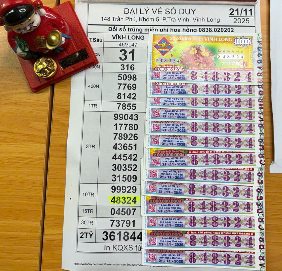 Anh Lưu Quốc Duy, chủ đại lý vé số Duy tại phường Trà Vinh (Vĩnh Long), đã nhanh chóng thực hiện việc đổi thưởng cho một khách hàng nữ quen thuộc. Theo đó, vị khách may mắn này đã sở hữu 14 tờ vé số có 5 số cuối là 48324, trúng giải ba đài Vĩnh Long, với tổng giá trị giải thưởng lên đến 140 triệu đồng. Anh Duy chia sẻ, toàn bộ số tiền trúng số đã được chuyển khoản ngay lập tức cho chủ nhân may mắn. Dãy số độc đắc của đài Vĩnh Long trong kỳ này là 361844.