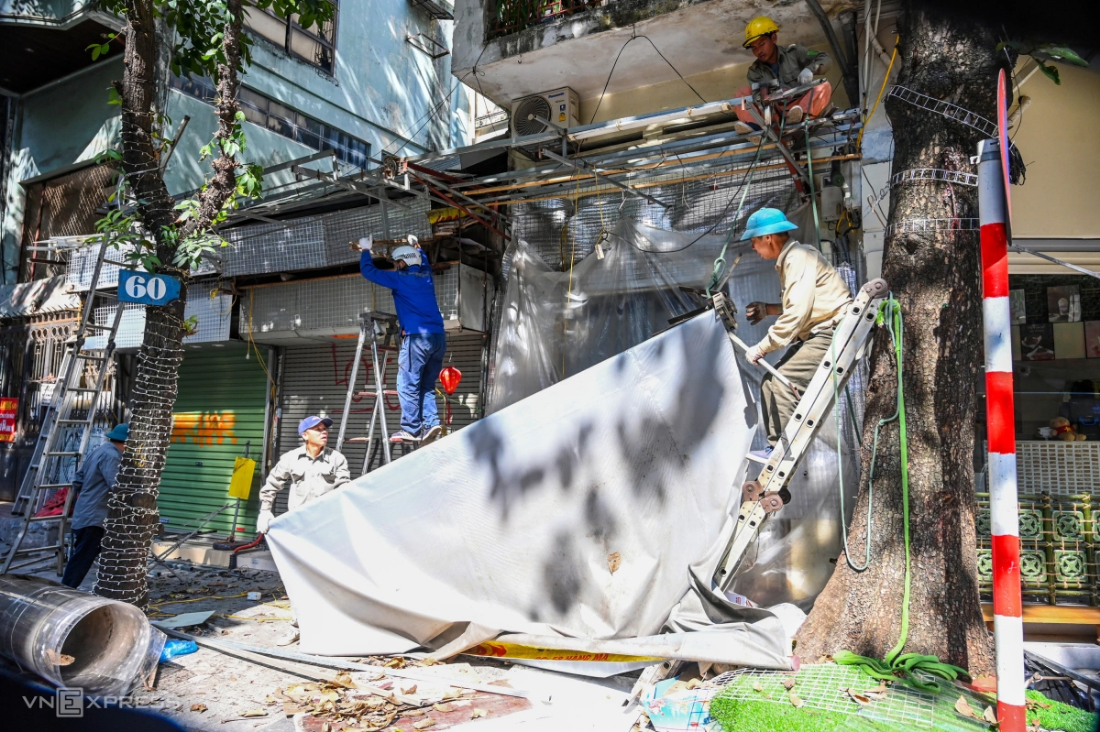 Để đảm bảo an toàn phòng cháy chữa cháy và trả lại không gian thông thoáng cho thành phố, nhiều hộ kinh doanh cùng các gia đình có mặt tiền trên phố đã chủ động tháo dỡ phần mái che tạm thời. Tuy nhiên, với những công trình kiên cố hơn, như mái che bằng kim loại trên phố Hàng Mã, quận Hoàn Kiếm, lực lượng chức năng đã phải mất nhiều giờ bóc tách, cẩn trọng tháo dỡ từng phần để khôi phục cảnh quan đô thị. Một trường hợp điển hình là mái che tầng một của một ngôi nhà trên phố Hàng Mã đã bị tháo dỡ do vi phạm lấn chiếm nghiêm trọng.