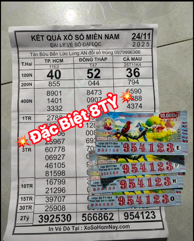 Niềm vui đầu tiên đến từ đại lý vé số Đại Lộc ở Tây Ninh (Long An cũ). Đại lý này vừa xác nhận đã đổi thưởng thành công cho một khách hàng may mắn với 4 tờ vé số trúng độc đắc. Theo kết quả xổ số miền Nam (XSMN) mở thưởng ngày 24 tháng 11, cả 4 tờ đều mang dãy số 954123, thuộc đài Cà Mau, với tổng giá trị giải thưởng lên đến 8 tỉ đồng (chưa trừ thuế).