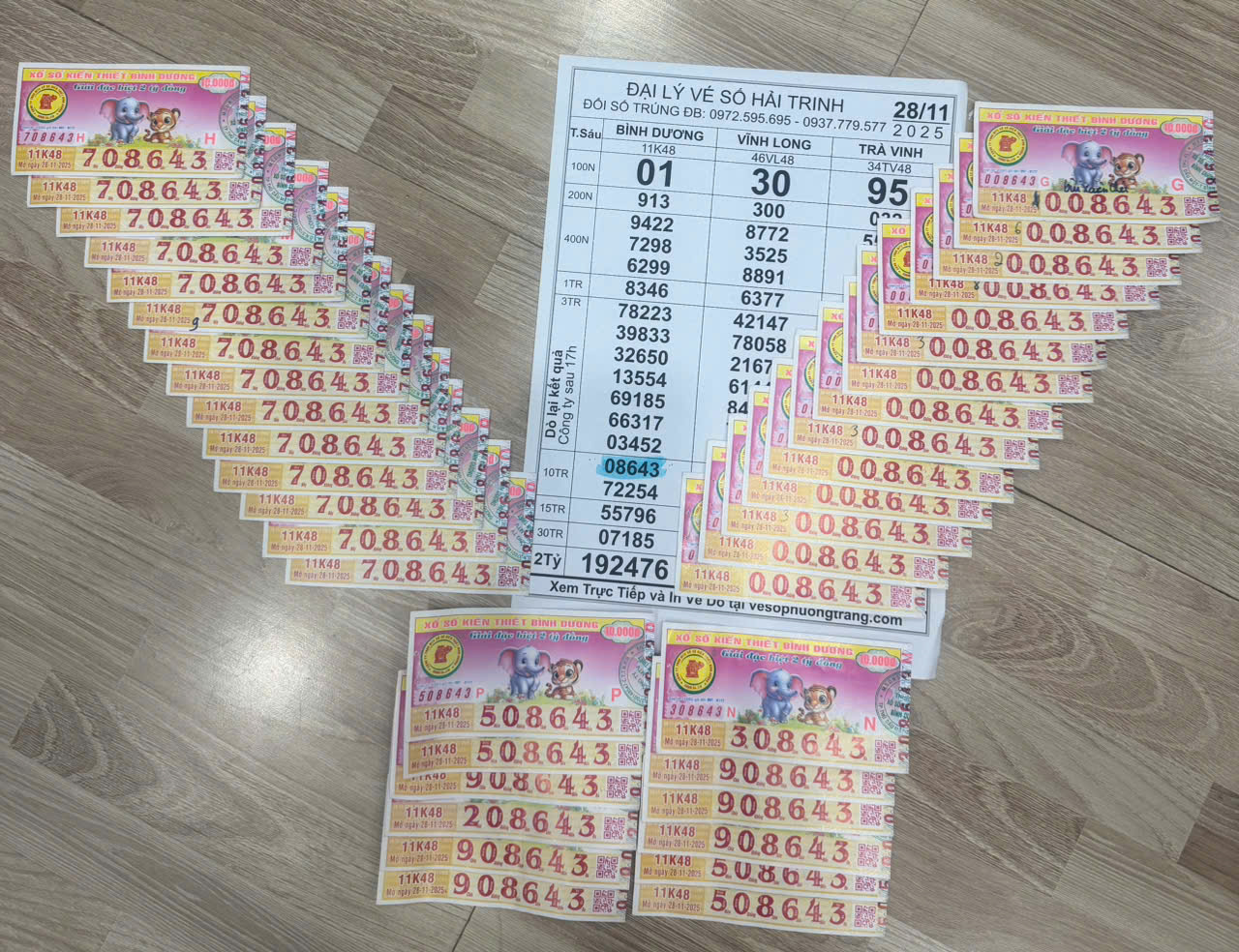 Mở màn cho chuỗi tin vui là Đại lý vé số Hải Trinh của anh Trần Quang Hải tại Đồng Nai (Bình Phước cũ). Anh Hải vừa xác nhận đã tiến hành đổi thưởng thành công cho khách hàng với tổng cộng **40 tờ vé số trúng giải ba** của đài Bình Dương, thuộc kỳ mở thưởng Xổ số miền Nam ngày 28 tháng 11. Cụ thể, 40 tờ vé số này có 5 số cuối là **08643**, mang về tổng giá trị giải thưởng lên đến **400 triệu đồng**. Trong cùng kỳ mở thưởng, giải độc đắc của đài Bình Dương thuộc về dãy số **138537**.
